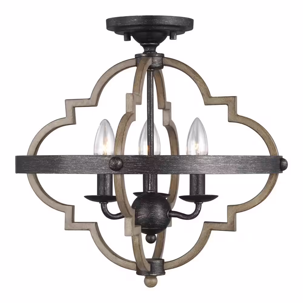 TRUE FINE Richwood 15 in. 3-Light Distressed Black/Wood Tone Rustic Semi-Flush Mount Ceiling Light
