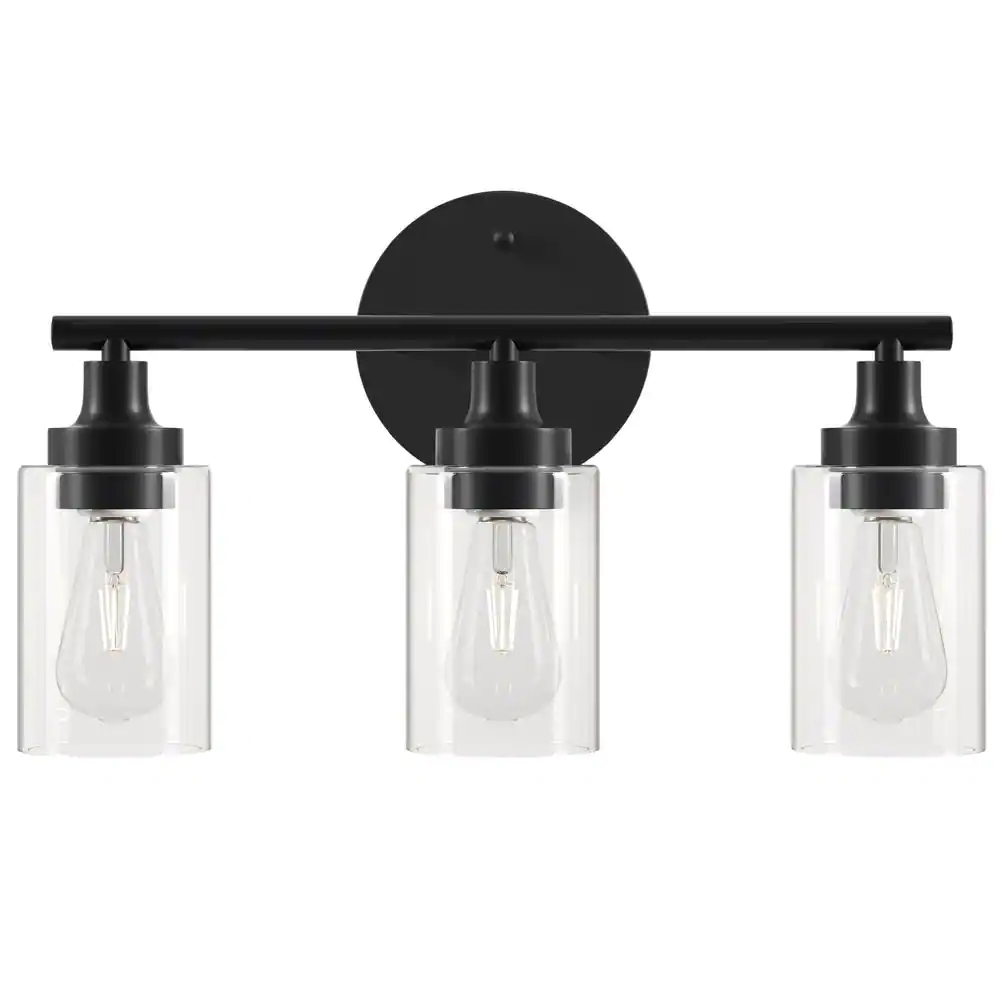 Hampton Bay Kendall Manor 22 in. 3 Light Matte Black Bathroom Vanity Light with Clear Glass Shades