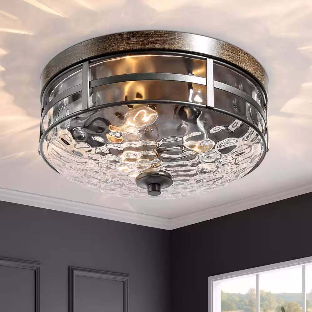JAZAVA 12 in. 2-Light Farmhouse Black Ceiling Light Fixture with Seeded Glass Shade Flush Mount