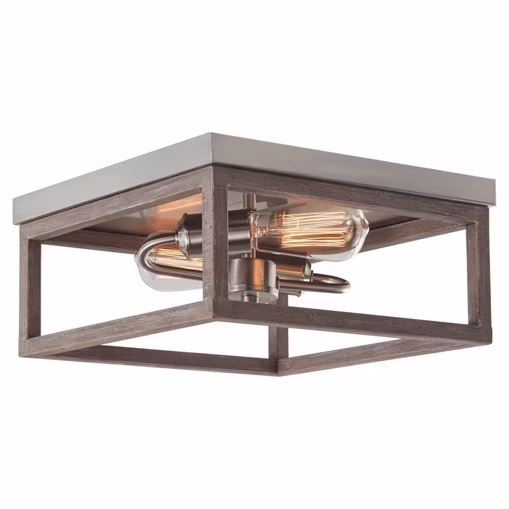 Hampton Bay Boswell Quarter 12 in. 2-Light Brushed Nickel with Weathered Wood Accents Coastal Flush Mount for Bedrooms with Bulbs