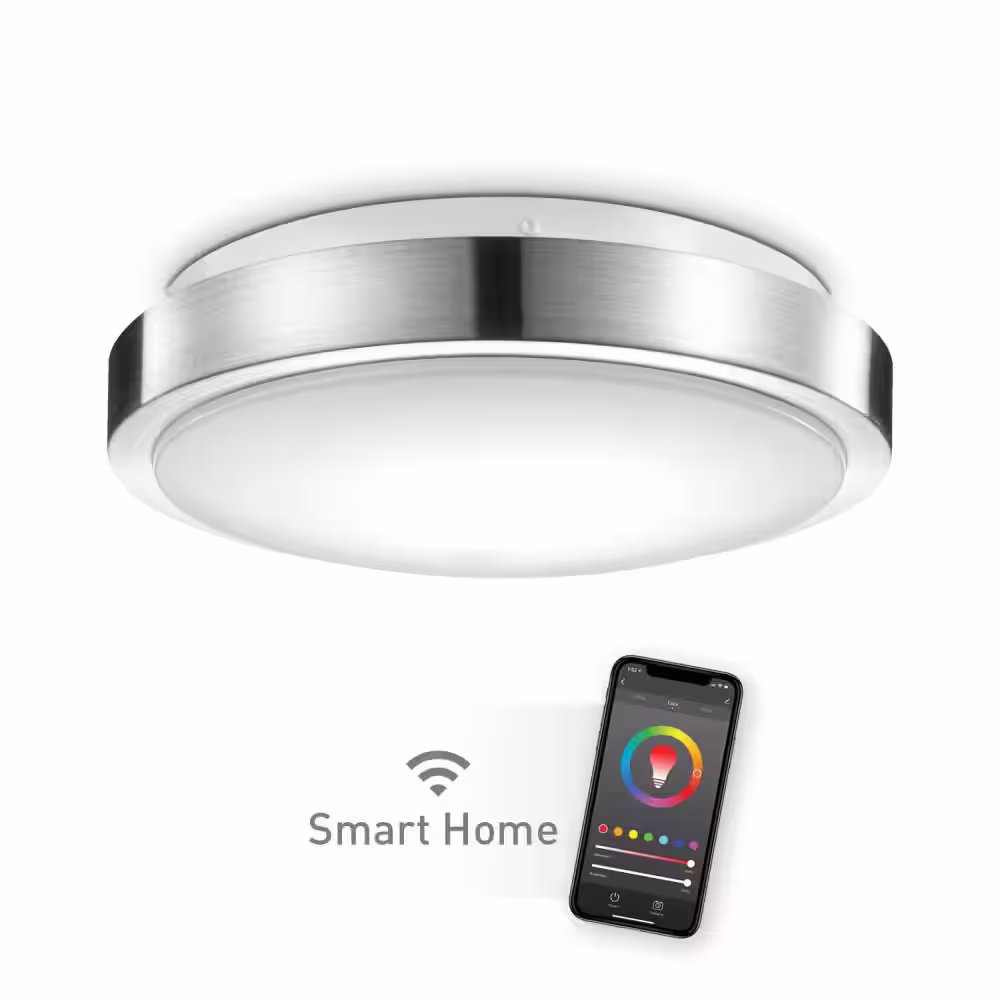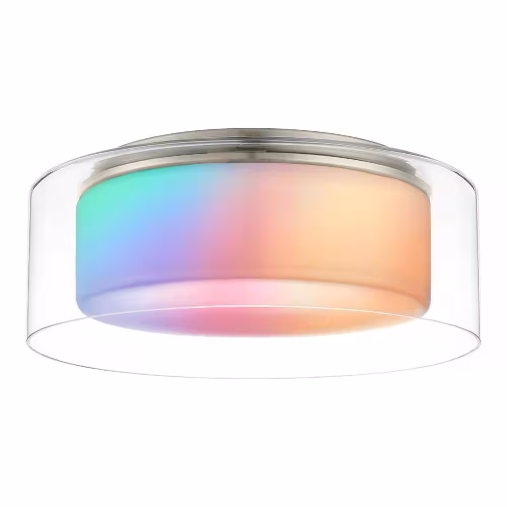 Home Decorators Collection Denning 13 in. Brushed Nickel Smart Voice Controlled CCT and RGB Color Selectable LED Flush Mount Powered by Hubspace