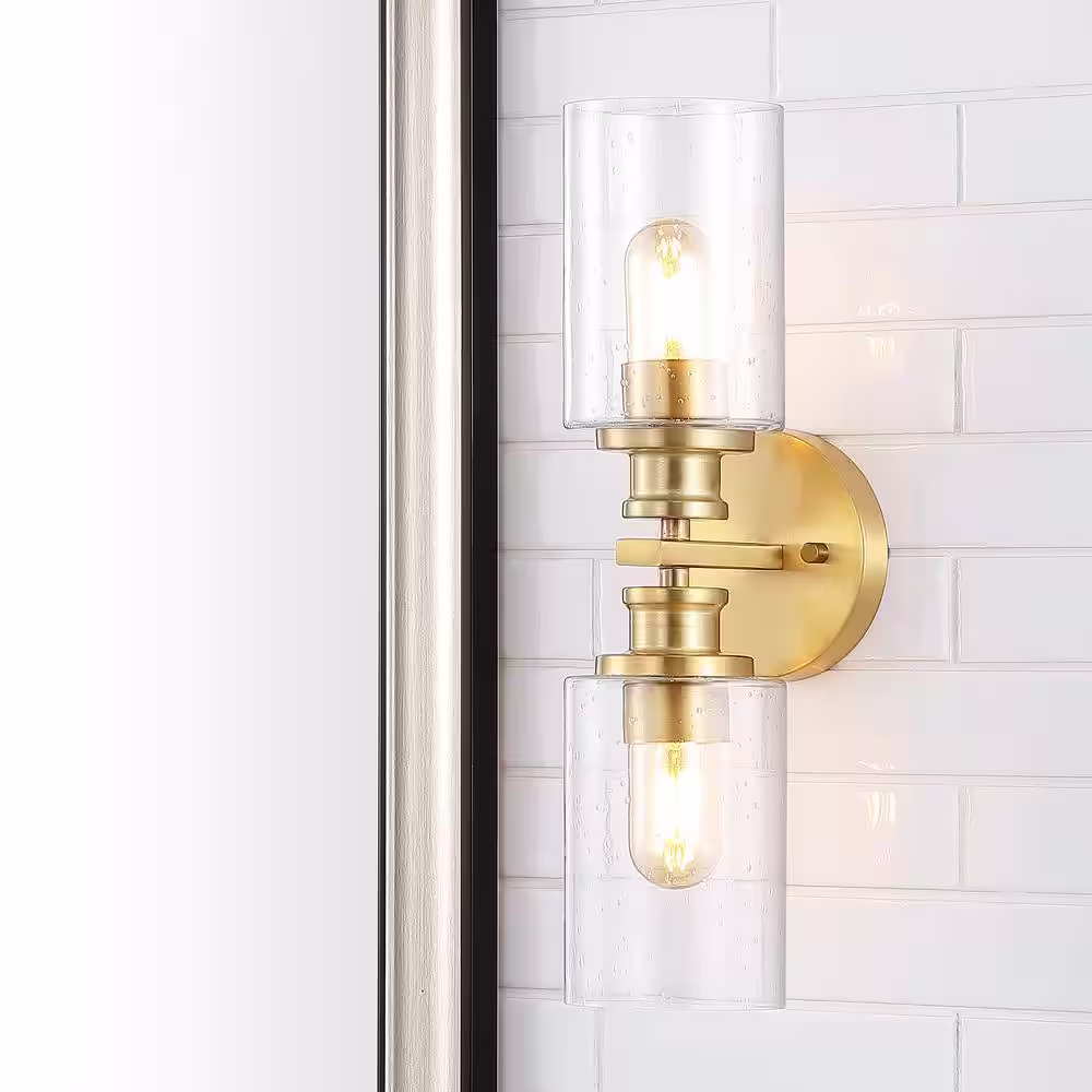 JONATHAN Y Jules Edison 16.5 in. 2-Light Brass Gold Cylinder Iron/Seeded Glass Farmhouse Contemporary LED Vanity Light