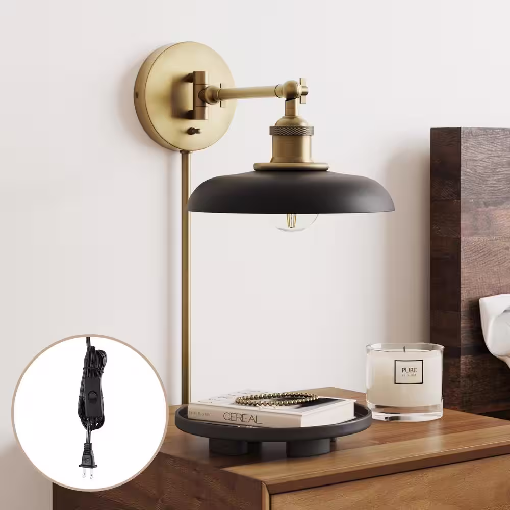 Nathan James Theodore 9 in. W 1-Light Vintaged Brass/Matte Black Industrial Wall Mounted Plugin Lamp Wall Sconce with Wide Bell Shade