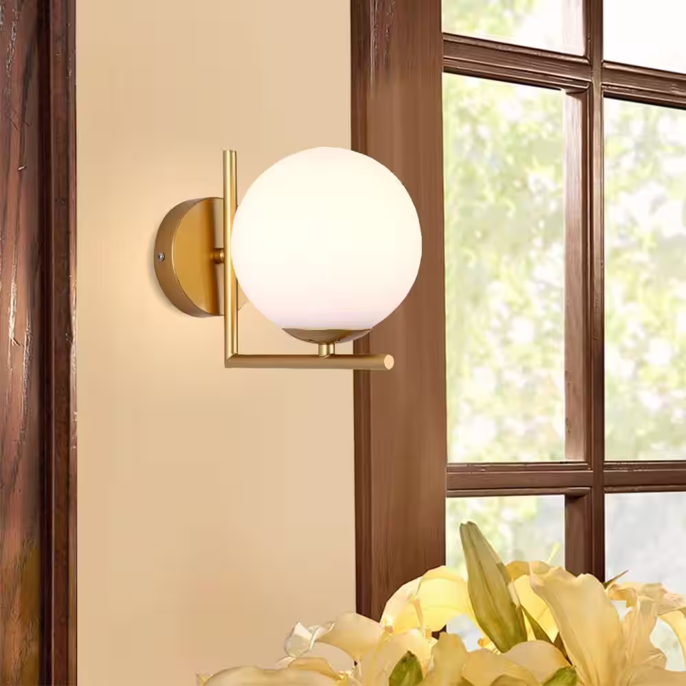 YANSUN 7.87 in. 1-Light Gold Metal Wall Sconce with White Shade, Postmodern Style Wall Lamp