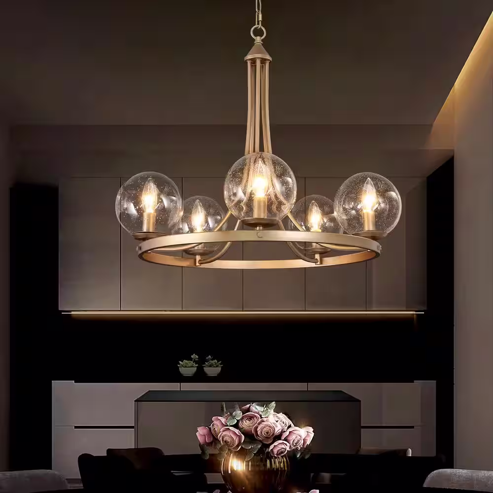 Uolfin Modern Gold Chandelier Pendant Light 5-Light Wagon Wheel Dining Room Chandelier with Seed Glass Shades