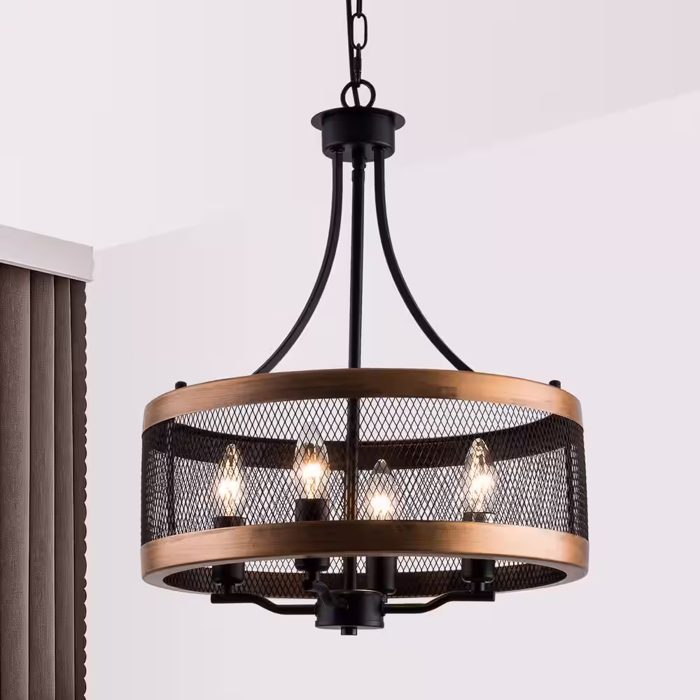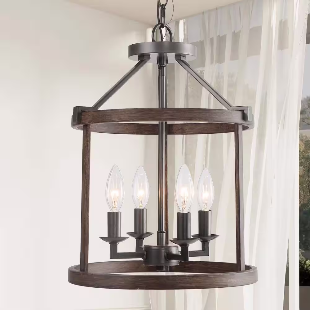 LNC Cordelia 4-Light Dark Wood Grain Candlestick Chandelier with Cage Shade and Rusty Black Candlestick Lights