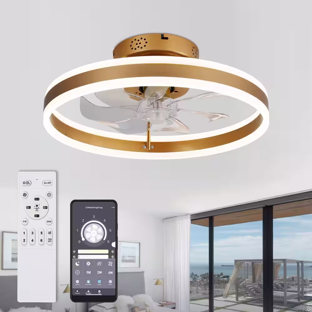 Oaks Aura 20 in. Integrated LED Indoor French Gold Modern Flush Mount Low Profile Ceiling Fan with Light, Smart App Remote Control