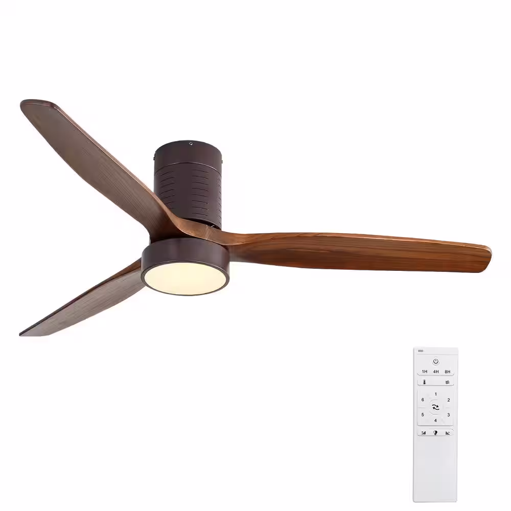 Runesay 52 in. Indoor Low Profile LED Light Ceiling Fan in Coffee with 3 Carved Wood Fan Blade and Remote Control