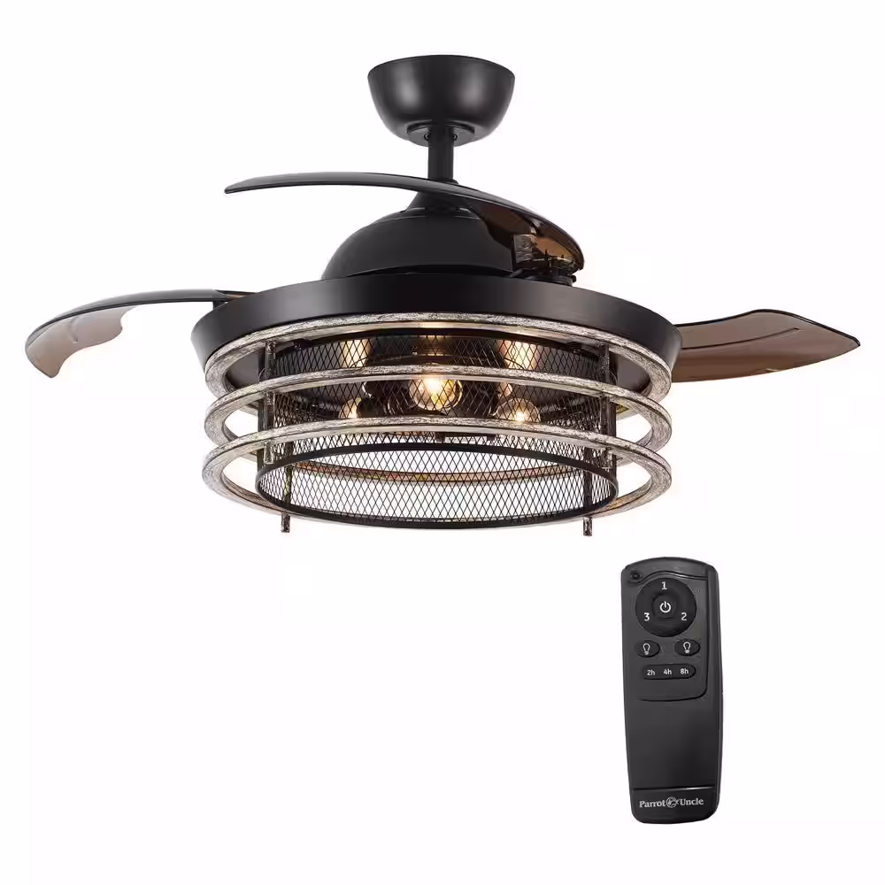 Parrot Uncle 42 in. Industrial Retractable 3-Blade Matte Black Ceiling Fan with Remote Control and Light Kit