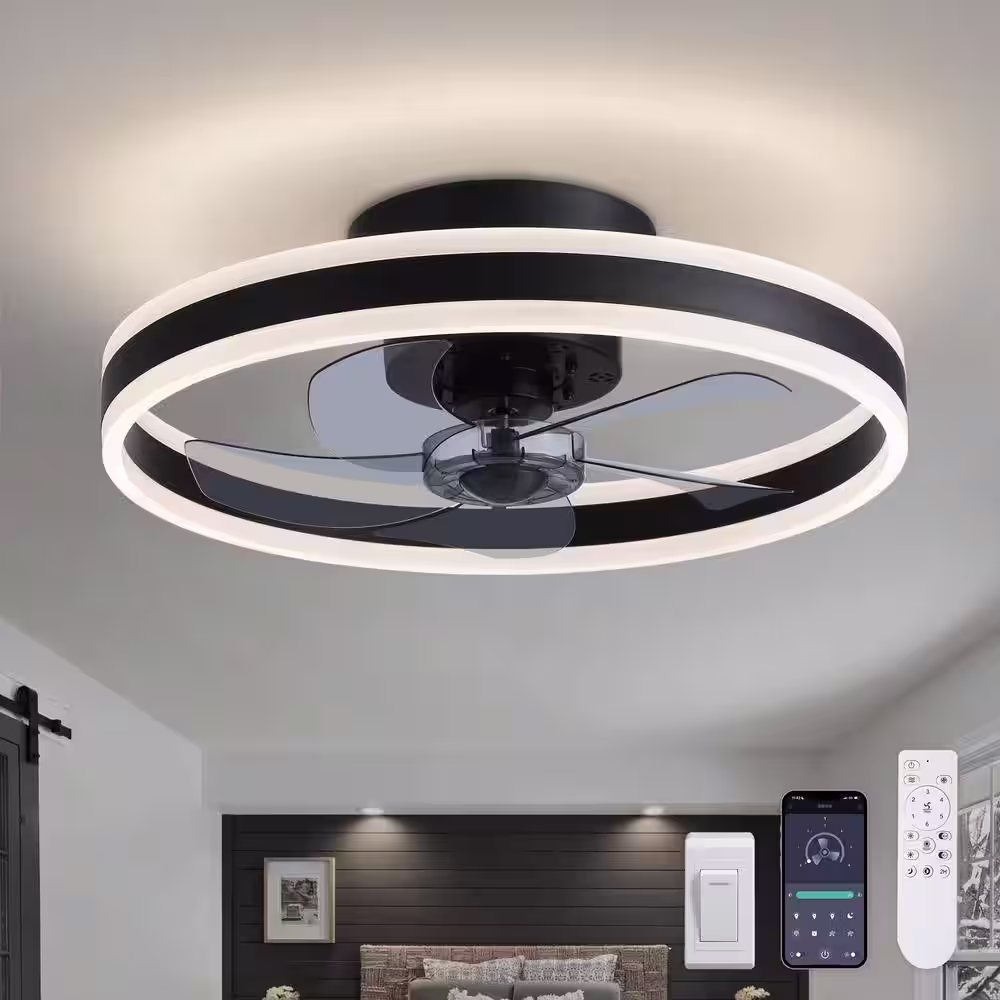 None 20 in. LED Modern Indoor Black Dimmable Flush Mount Hidden Blades Ceiling Fan with Light Remote APP Control for Bedroom
