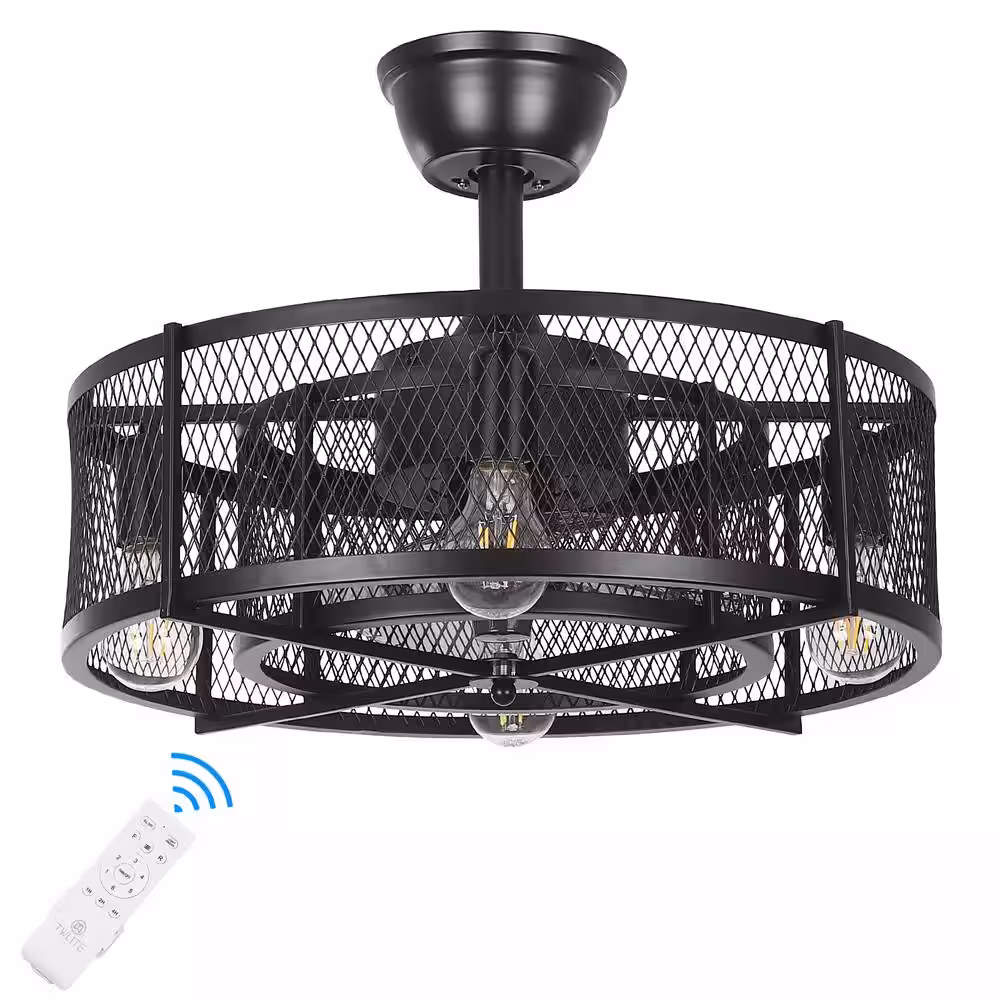 None 19 in. 4-Lights Indoor Black Wood Grain Industrial Metal Cage Enclosed Ceiling Fan and Light Kit, Remote