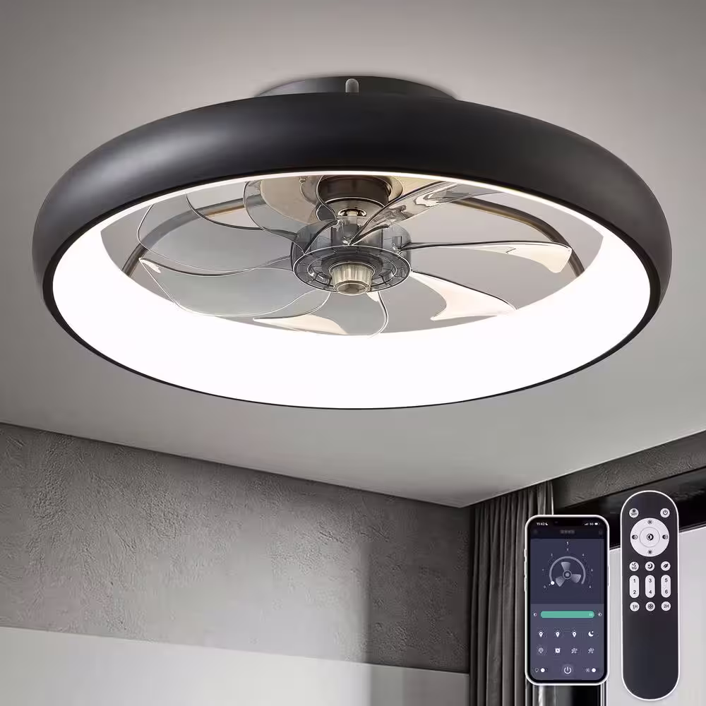 None 20 in. Integrated LED Indoor Black Flush Mount Dimmable Ceiling Fan with Light APP and Remote Control