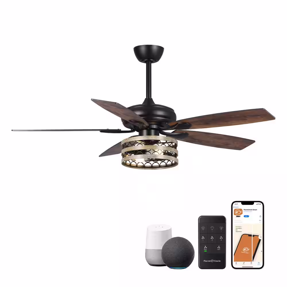 Parrot Uncle Toronto 52 in. Indoor Farmhouse Black LED Smart Ceiling Fan with Light and Remote, Works with Google Home and Alexa