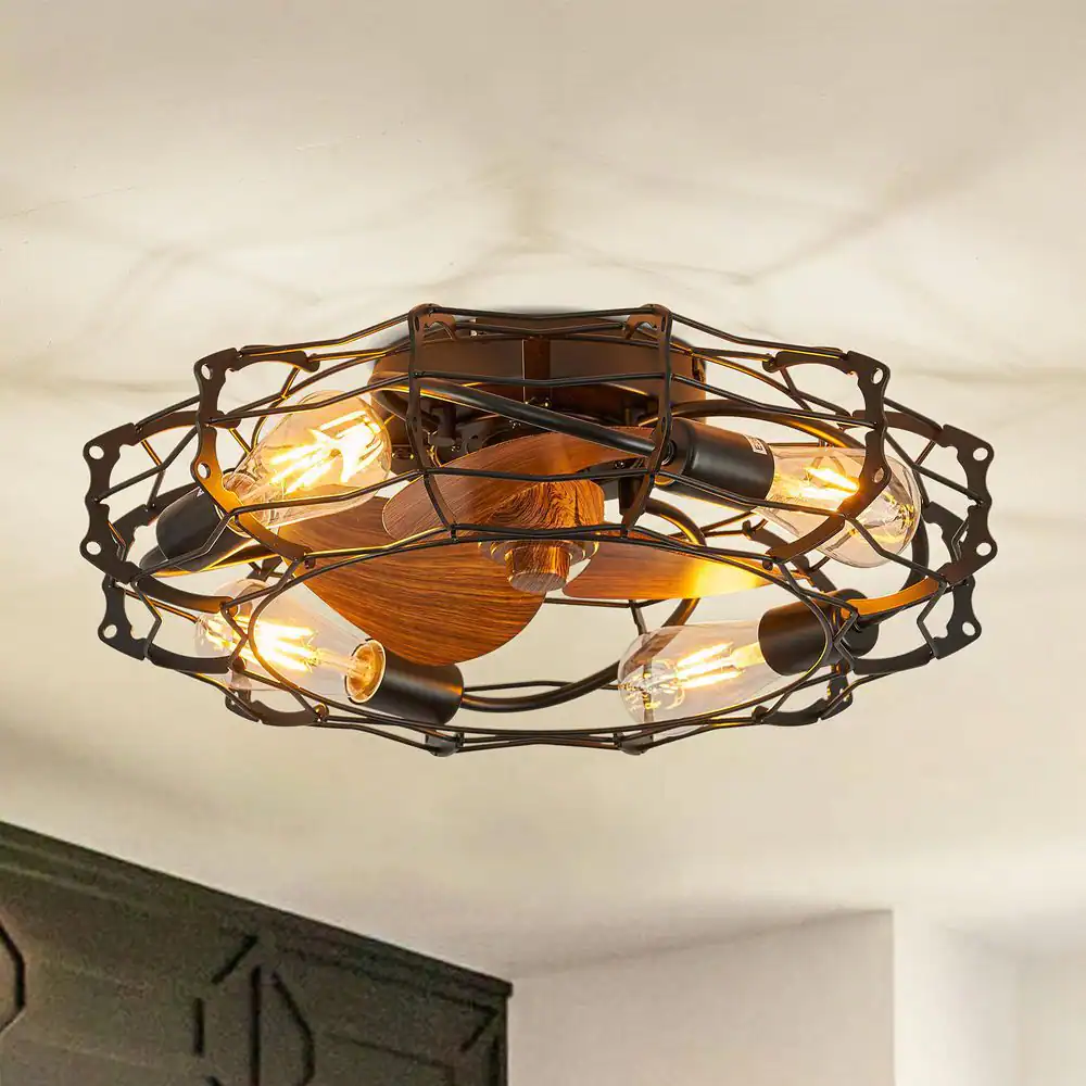 None 20 in. 4-Light Indoor Black Low Profile Ceiling Fan with Light Farmhouse Caged Ceiling Fan with Remote Wood Grain Blades
