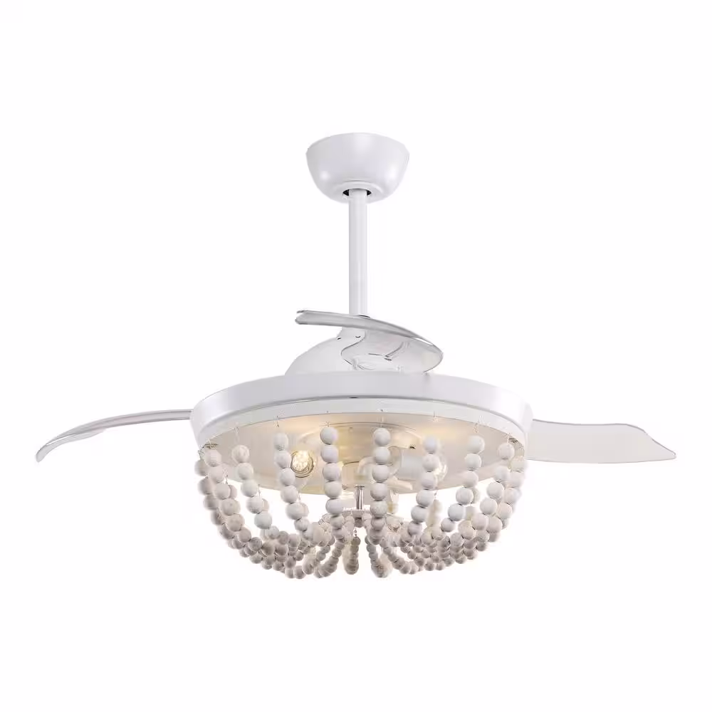 Parrot Uncle Huang 42 in. Wooden Beads Retractable 3-Blade White Ceiling Fan Chandelier with Remote Control and Light Kit