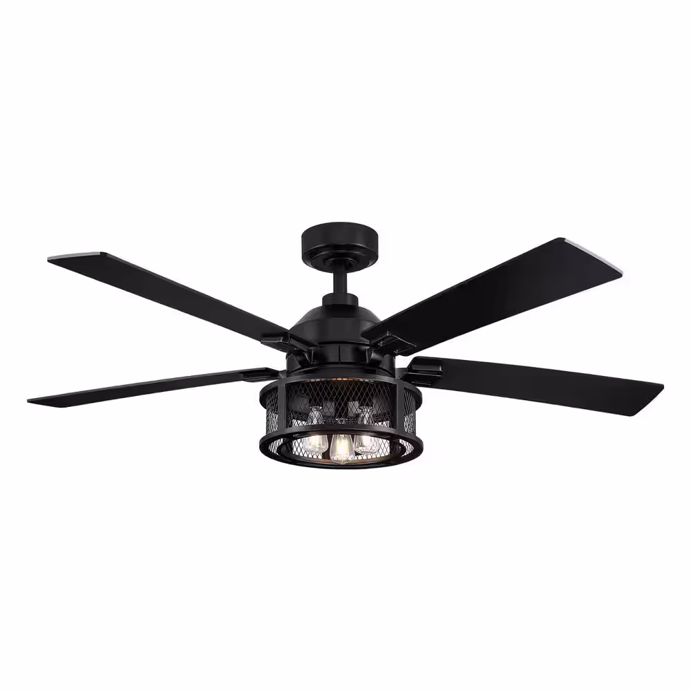 Parrot Uncle 52 in. Industrial Mesh Metal Reversible Blades Black Ceiling Fan with Remote Control and Light Kit