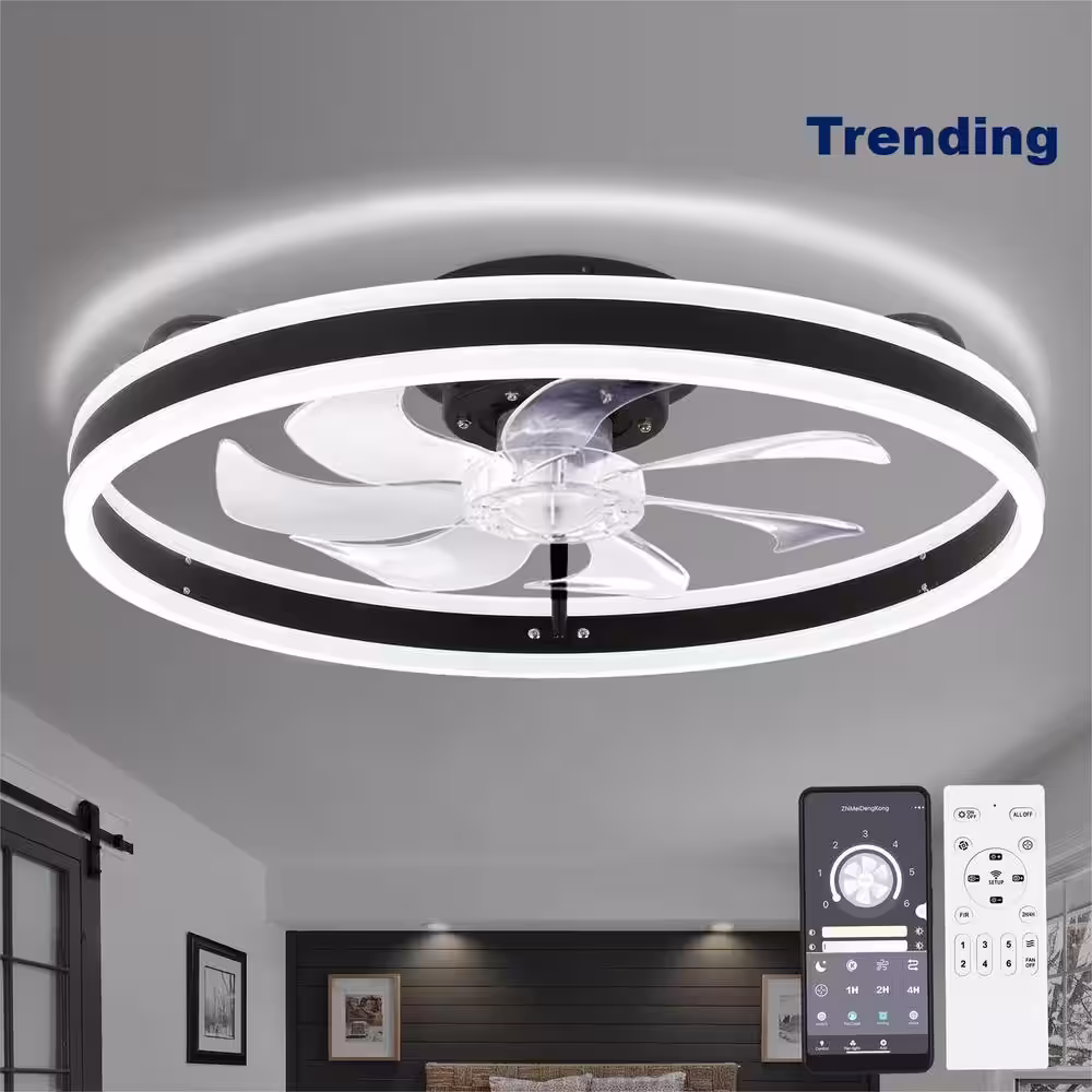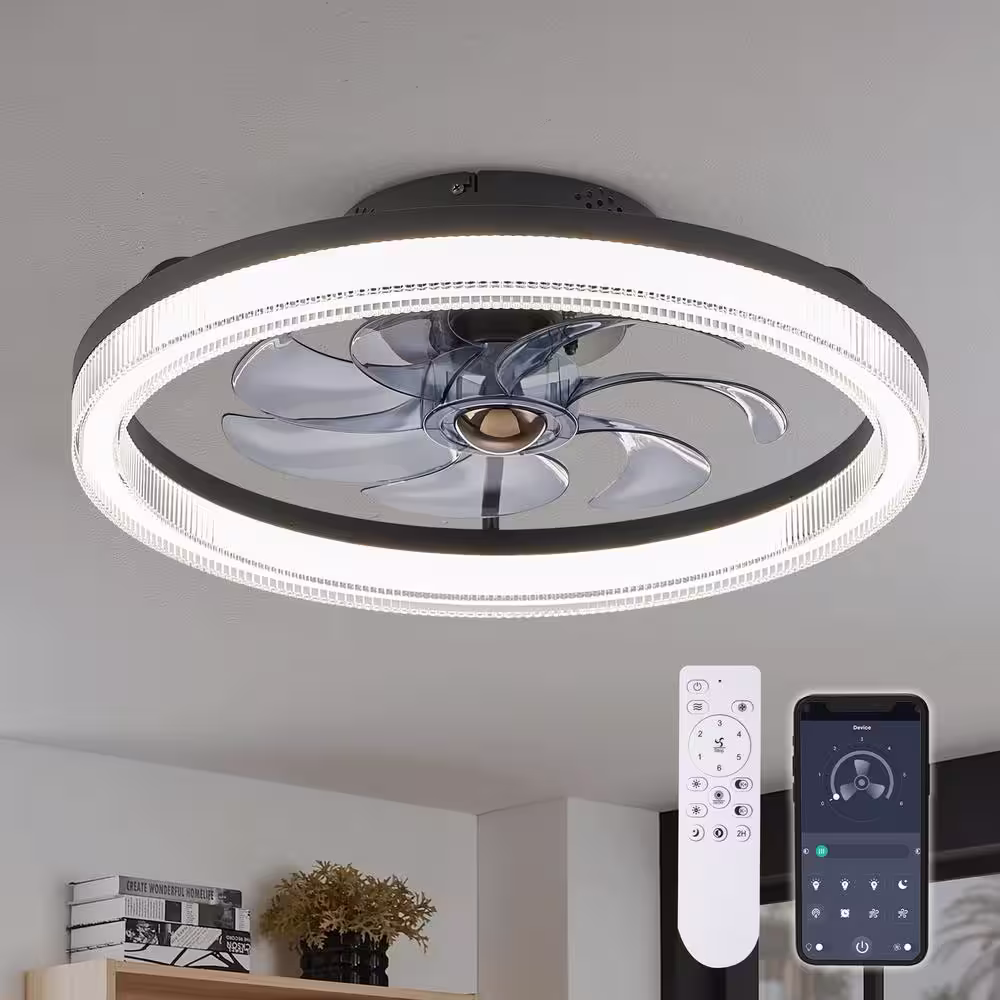 Oaks Aura 20in. LED Indoor Black Bladeless Low Profile Ceiling Fan Flush Mount Smart App Remote Control Dimmable Lighting