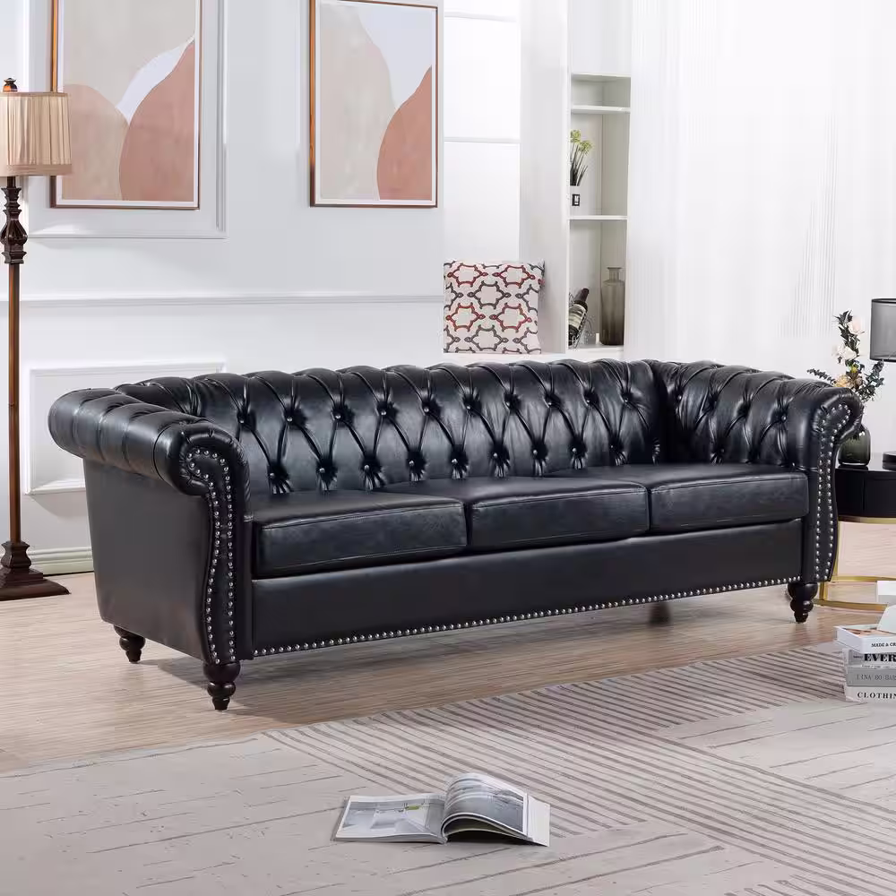Harper & Bright Designs 84 in. W Rolled Arm Faux Leather Chesterfield Straight Sofa in Black