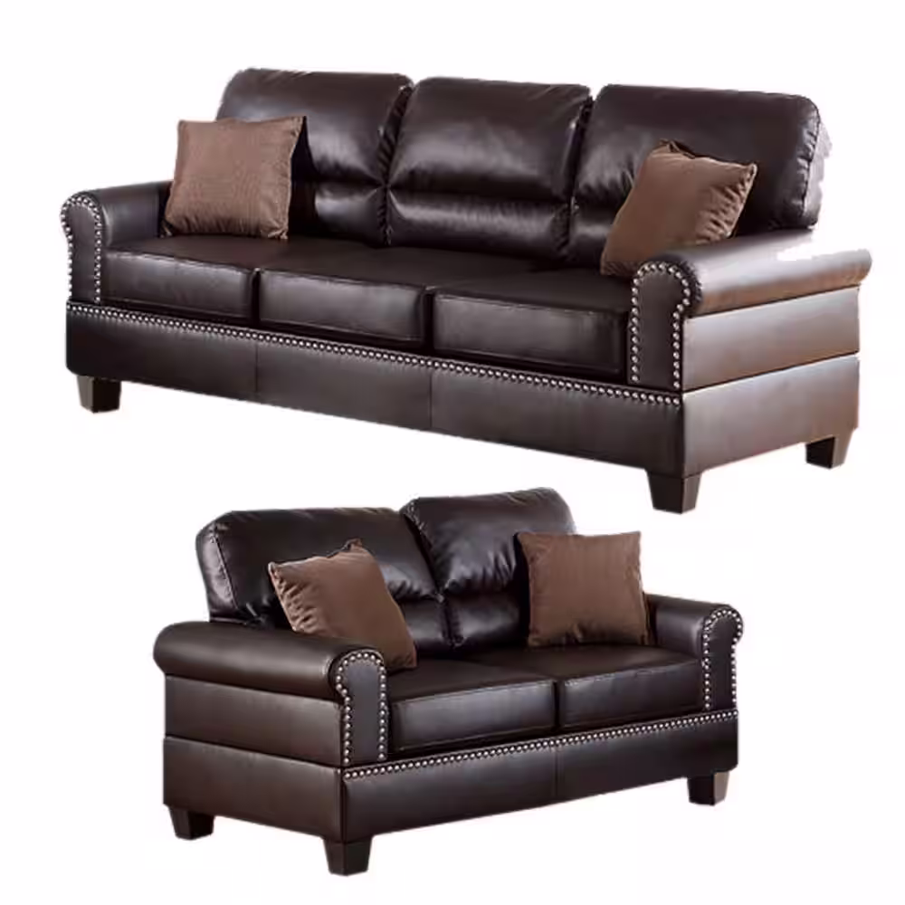 Benjara 57 in. Round Arm Bonded Leather Straight 2-Piece Sofa Set with Pillows Brown