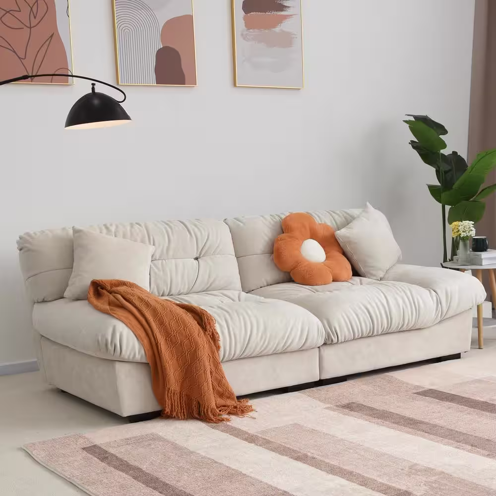 J&E Home 89 in. W Square Arm Velvet Rectangle 3-Seats Modern Cloud Sofa in Beige