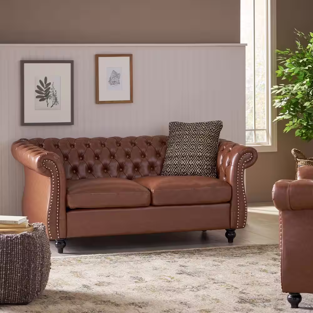 Noble House Silverdale 61.75 in. Cognac Brown Solid Faux Leather 2-Seat Loveseats with Nailhead