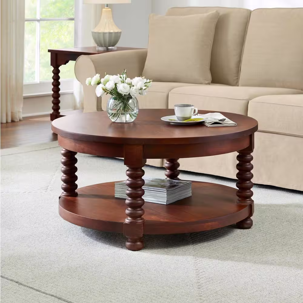 Home Decorators Collection Glenmore Medium Walnut Brown Round Wood Coffee Table with Detailed Legs