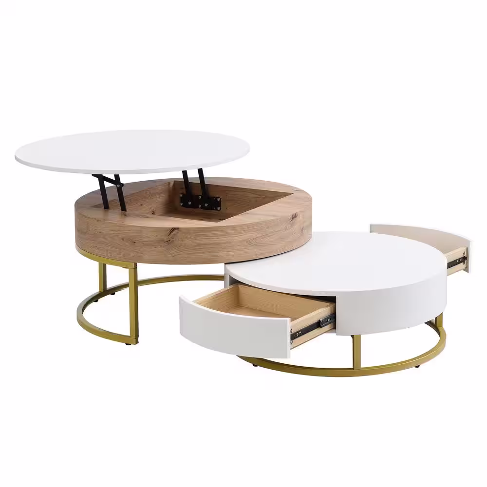Harper & Bright Designs Multifunctional 31.5 in. White and Natural Round MDF Lift-top Nesting Coffee Table, Accent Table Set with Drawers