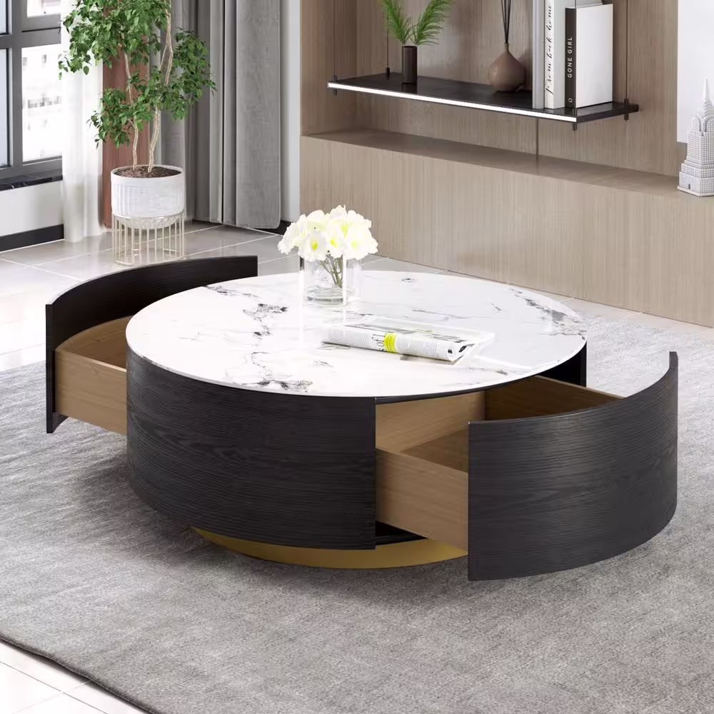 Magic Home 33.47 in. Black Drum Modern Sintered Stone Top Coffee Table with 2 Drawers