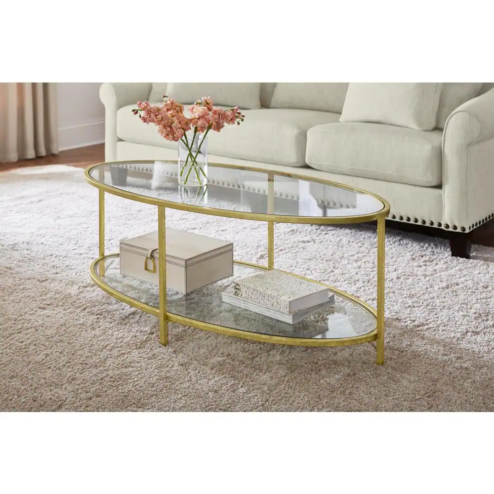 Home Decorators Collection Bella 46 in. Gold Leaf/Clear Large Oval Glass Coffee Table with Shelf