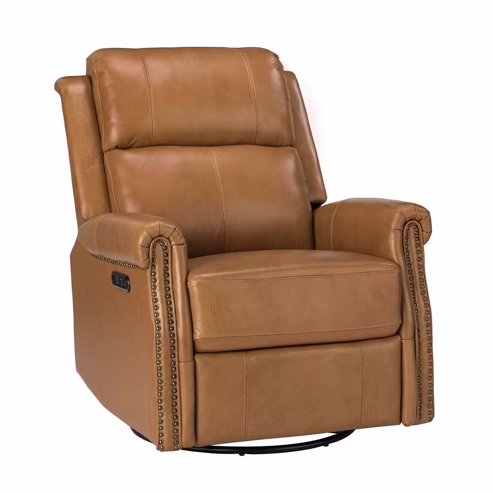JAYDEN CREATION Kaletan Traditional Camel Genuine Leather Power Sliding and Rocking Swivel Recliner Nursery Chair with Rolled Arms