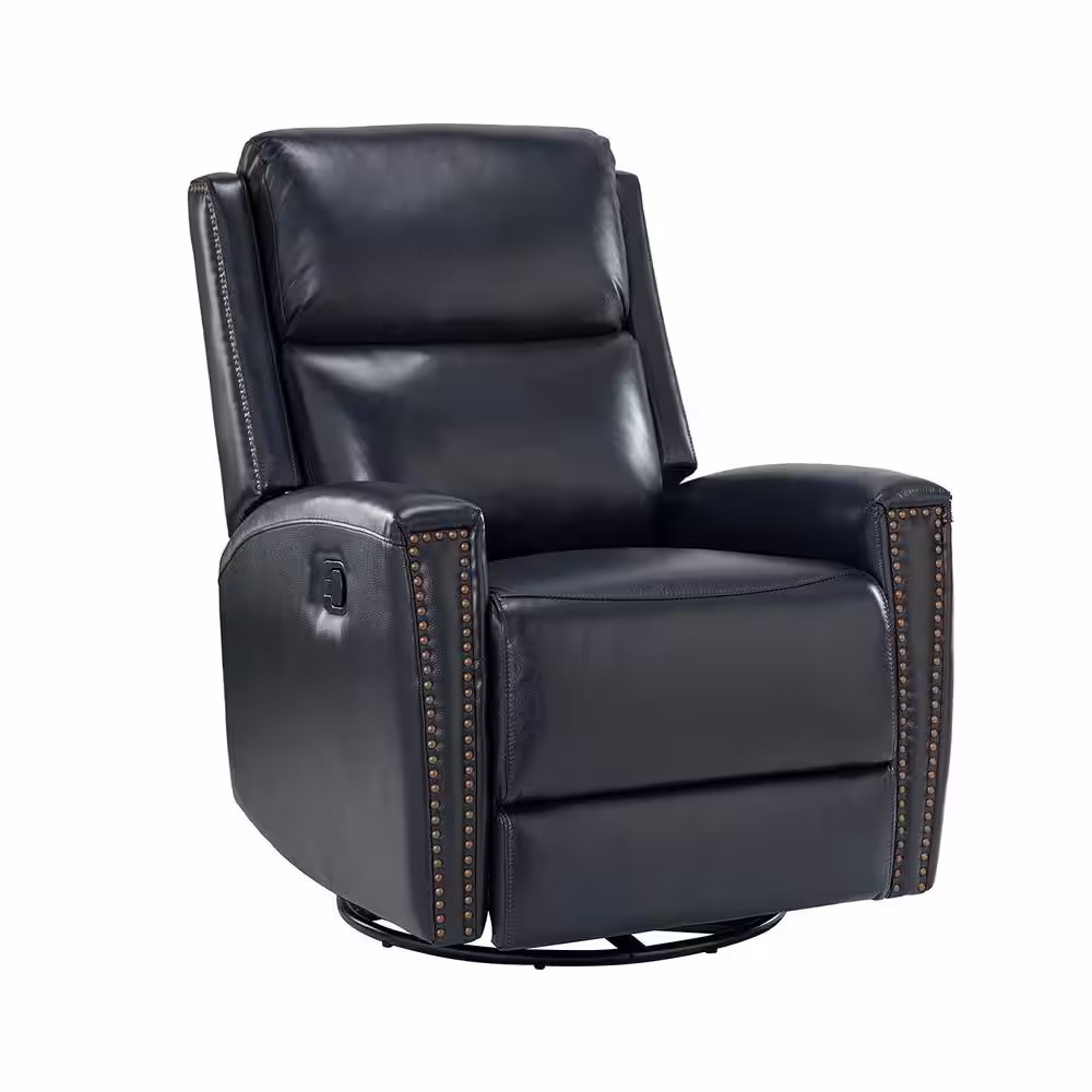 None Savino Minimalist design 30.31 in. Wide Genuine Leather Swivel Rocker Recliner with Nailhead Trim and Tufted Back- Navy