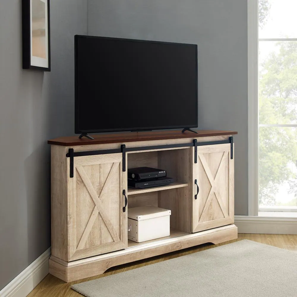 Welwick Designs 52 in. Traditional Brown and White Oak Wood Corner TV Stand with 2-Sliding Barn Doors fits TVs up to 58 in.