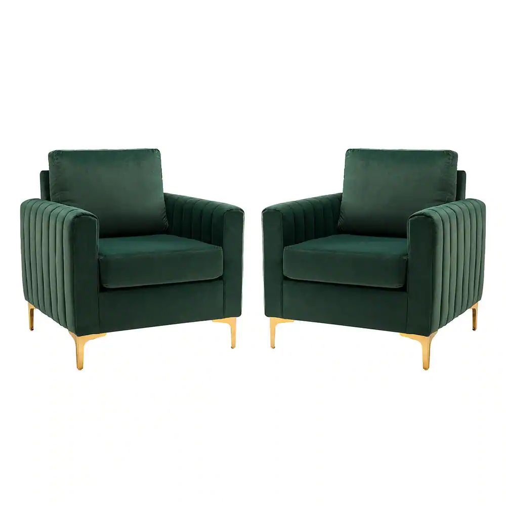 JAYDEN CREATION Ennomus Modern Green Velvet Cushion Back Club Chair with Golden Metal Legs and Track Arms (Set of 2)