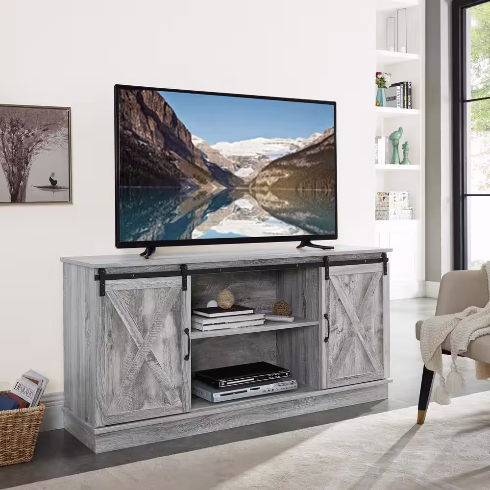 HOMESTOCK 58 in. Gray Farmhouse TV Stand, Rustic Wooden 60 in. TV Console Cabinet with Sliding Barn Doors Entertainment Center