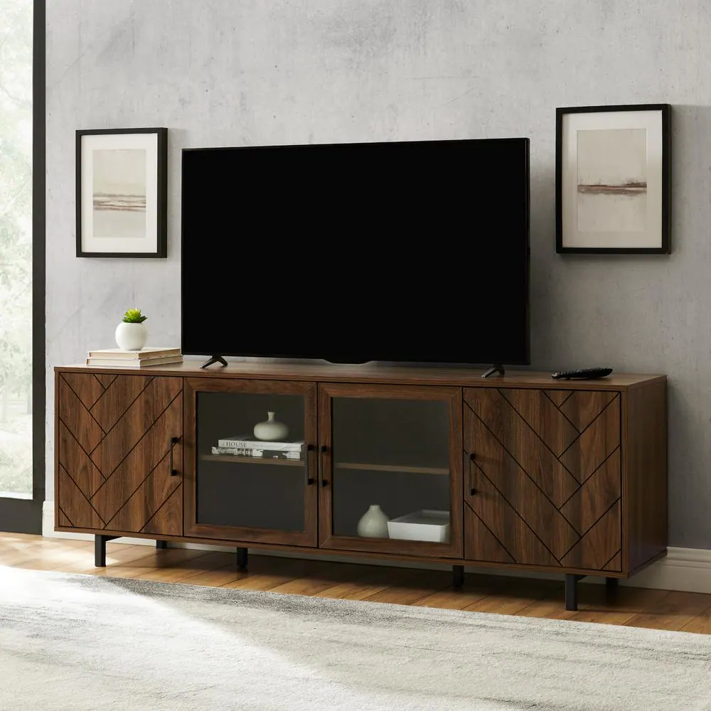 Welwick Designs 70 in. Dark Walnut Wood and Glass Modern Herringbone TV Stand with 4-Drawers (Max tv size 80 in.)