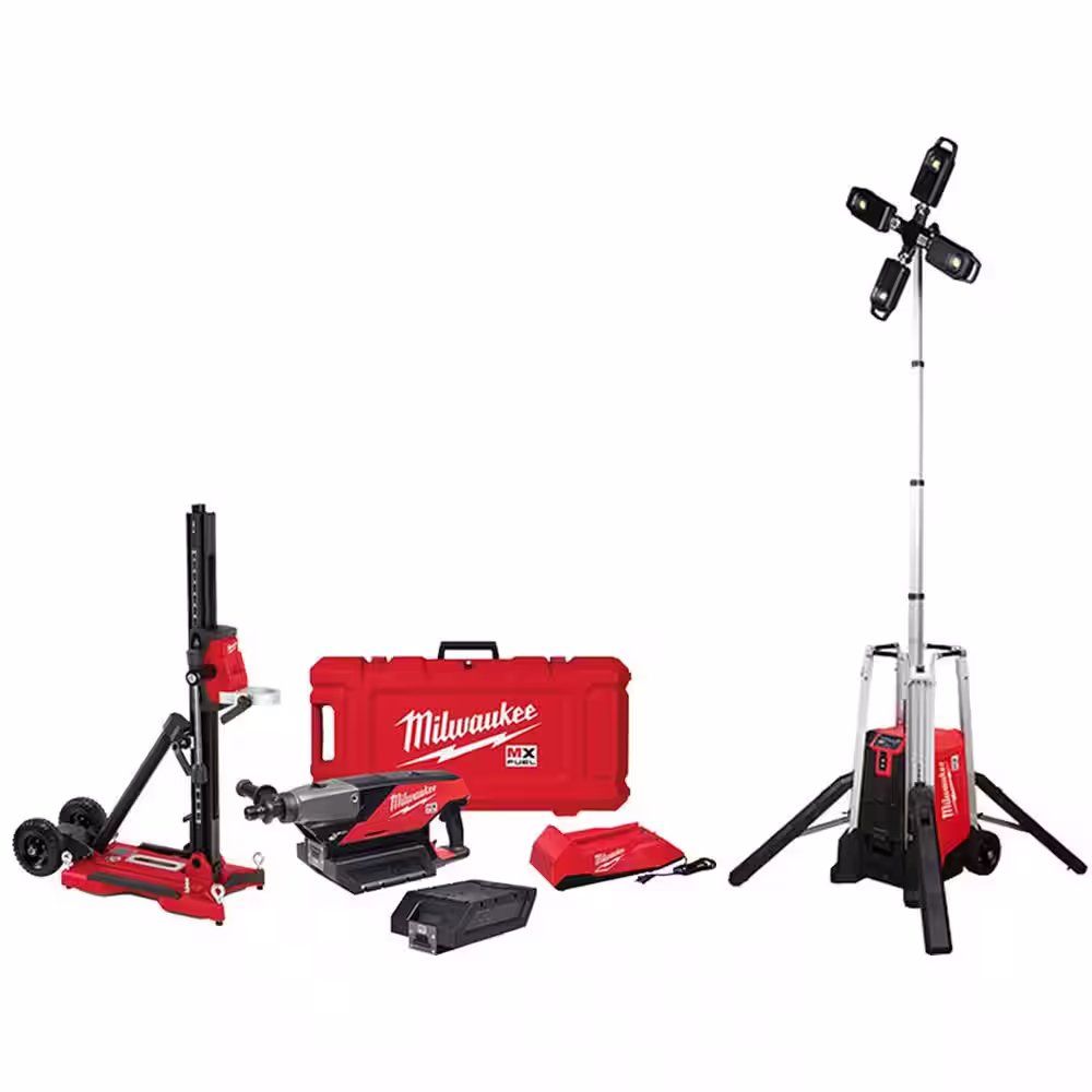 Milwaukee MX FUEL ROCKET Tower Light/Charger and MX FUEL Lithium-Ion Cordless Handheld Core Drill Kit with Stand