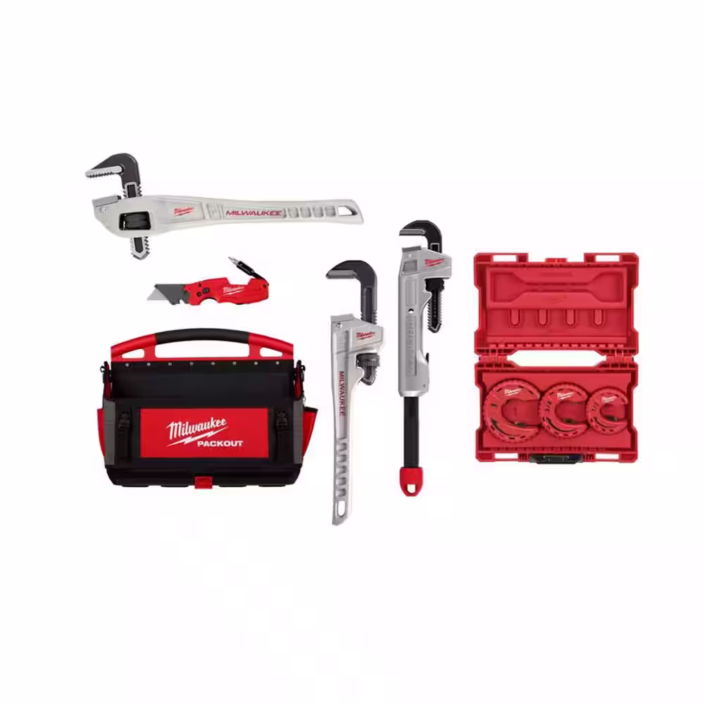 Milwaukee Packout Tote w/14 in. Alumium Pipe Wrench, 14 in. Al Offset Pipe Wrench, CHEATER Aluminum Pipe Wrench & Fastback Knife