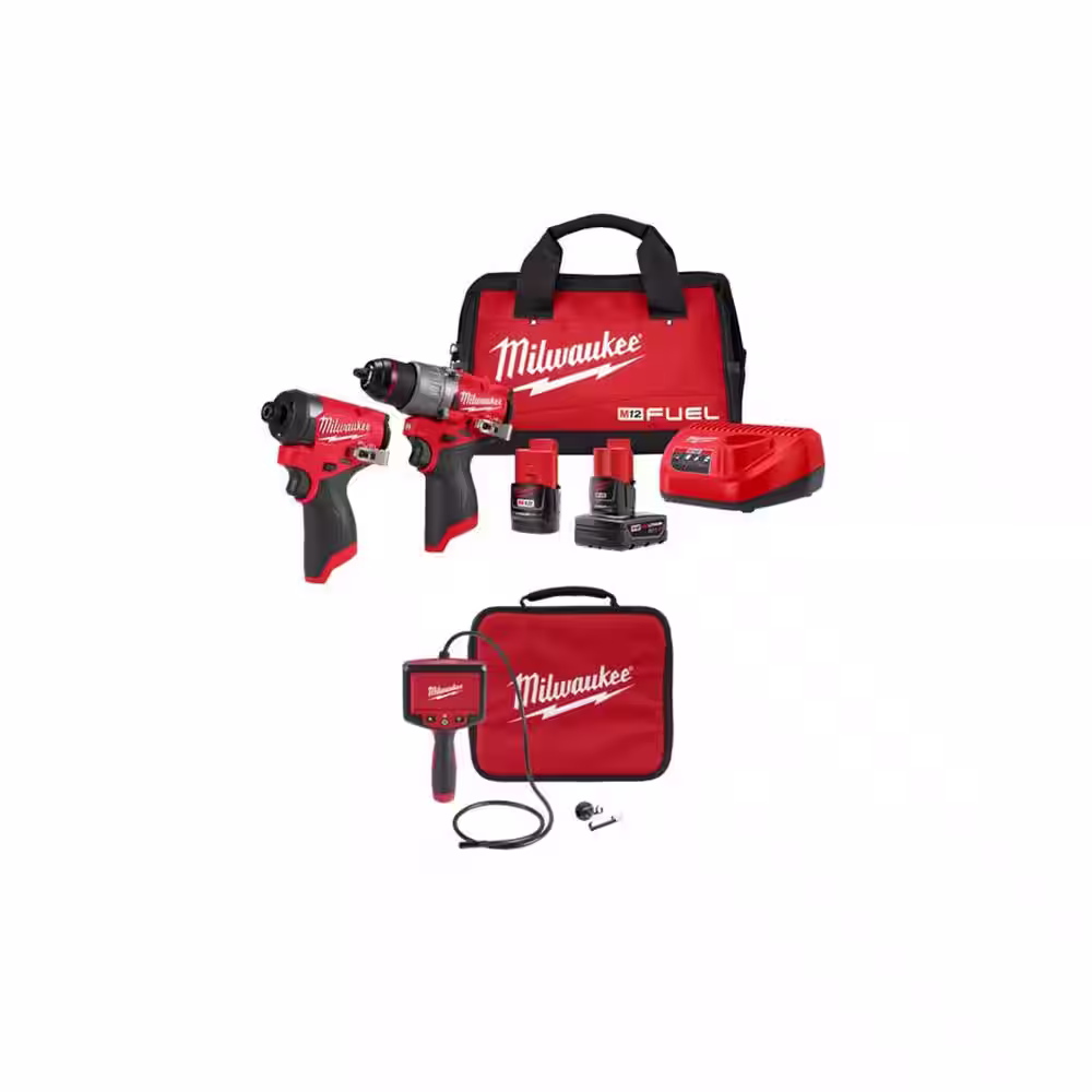 Milwaukee M12 FUEL 12V Lithium Ion Brushless Cordless Hammer Drill and Impact Driver Kit w/M-Spector 4 ft. Inspection Camera Scope