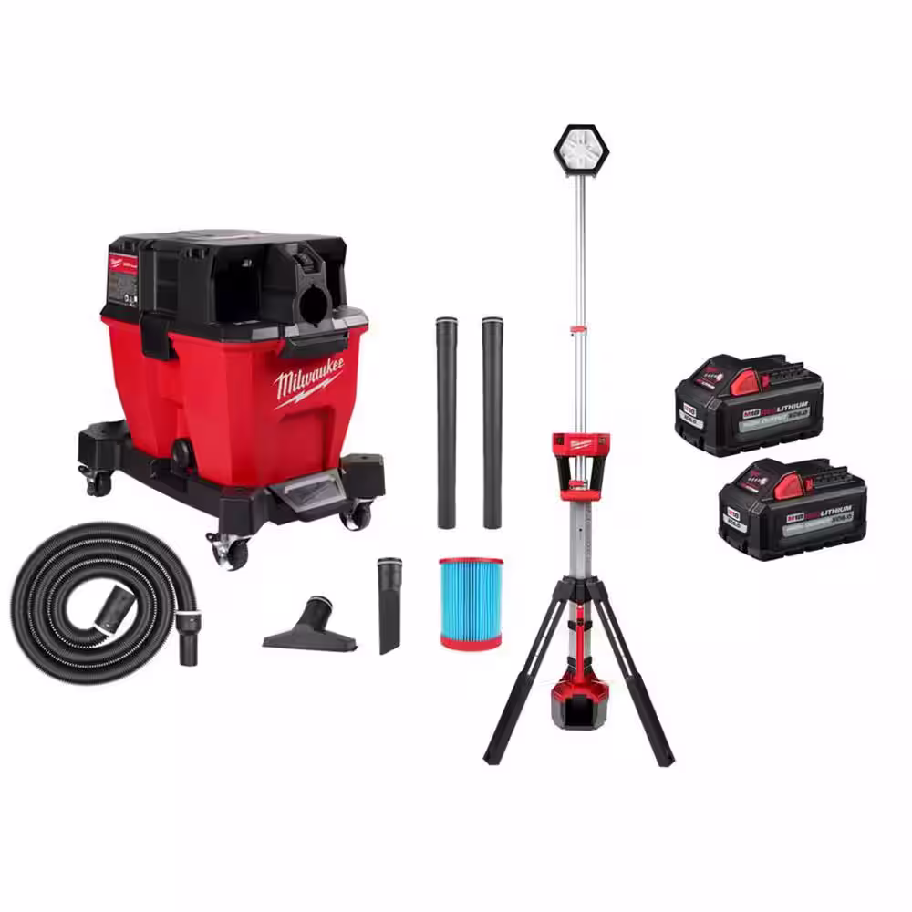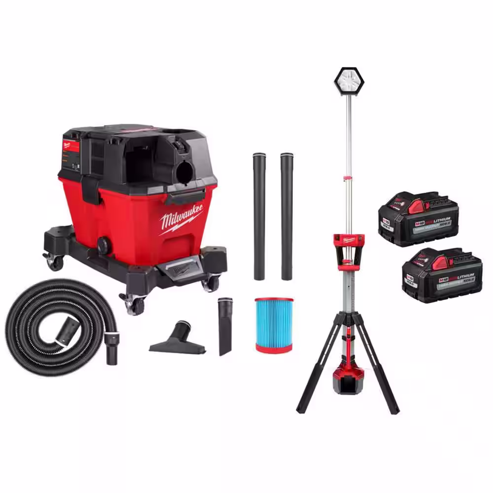 Milwaukee M18 FUEL 9 Gal. Cordless DUAL-BATTERY Wet/Dry Shop Vacuum & Dual Power Tower Light w/M18 6.0Ah Batteries (2-Pack)