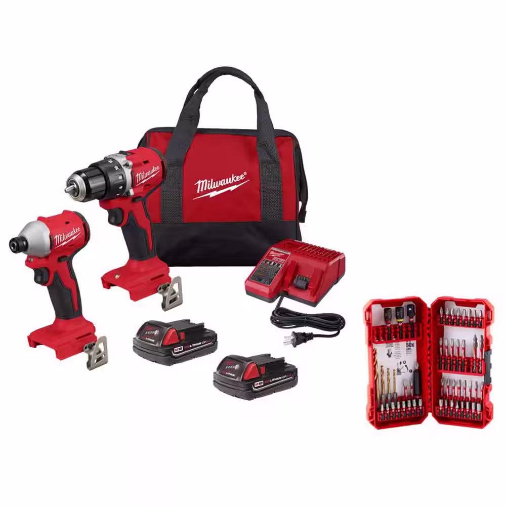 Milwaukee M18 18V Lithium-Ion Brushless Cordless Compact Drill/Impact Combo Kit with SHOCKWAVE Screwdriving Drill Bit Set