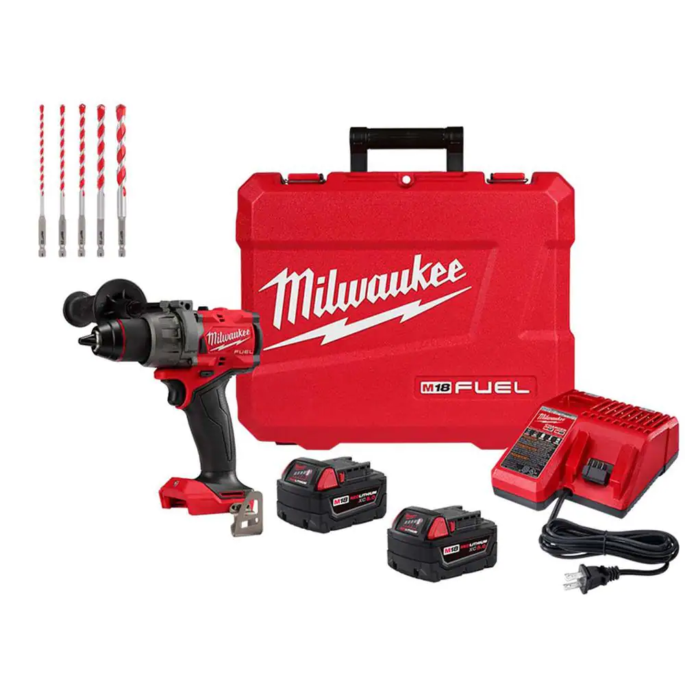 Milwaukee M18 FUEL 18-Volt Lithium-Ion Brushless Cordless Hammer Drill Kit with SHOCKWAVE Carbide Hammer Drill Bit Set (5-Piece)