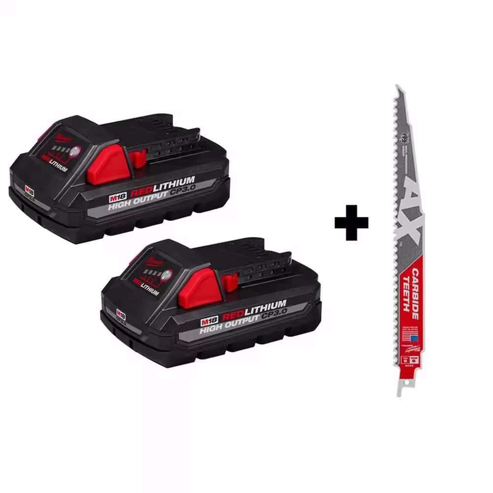 Milwaukee M18 18-Volt Lithium-Ion HIGH OUTPUT CP 3.0 Ah Battery Pack (2-Pack) w/9 in. 5 TPI AX Carbide Reciprocating Saw Blade