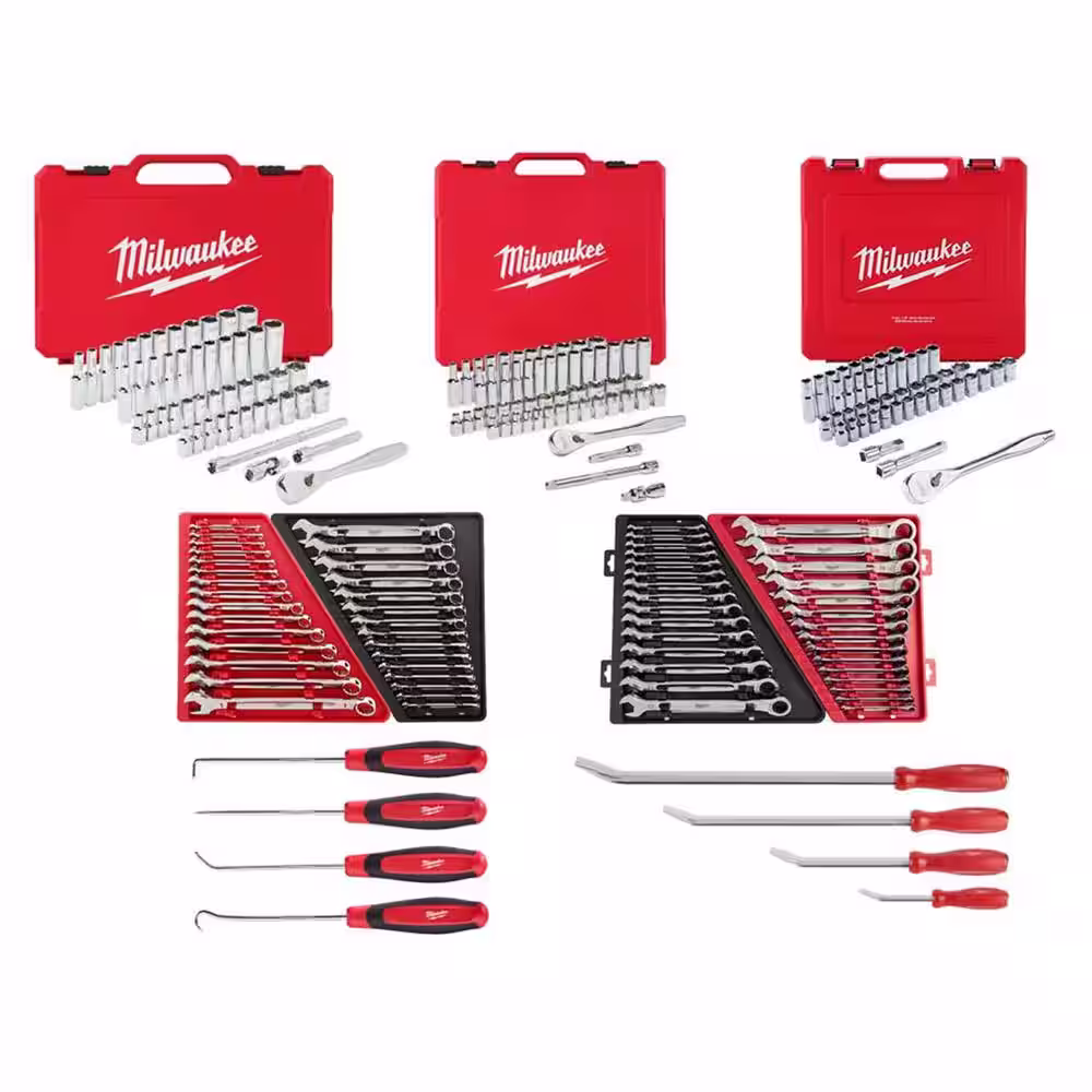 Milwaukee 1/4 in., 3/8 in., and 1/2 in. Drive SAE/Metric Ratchet and Socket Set w/Combination Wrench and Pry Bar Set (221-Piece)