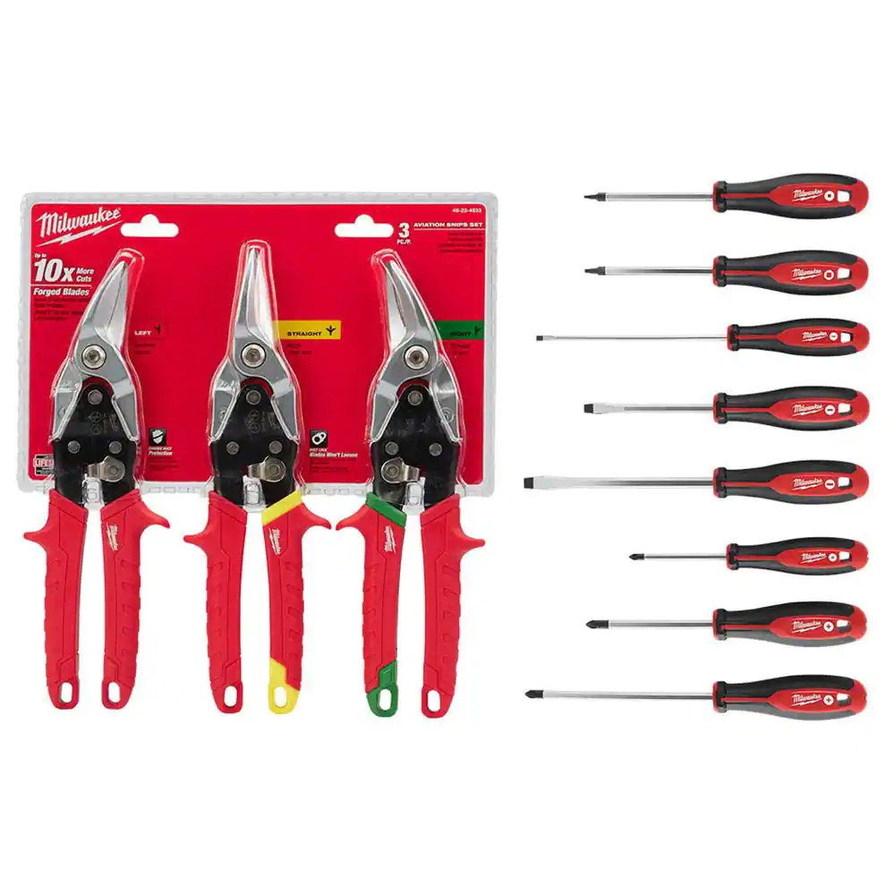 Milwaukee Straight-Cut Offset Aviation Snip (3-Pack) with Screwdriver Set (8-Piece)