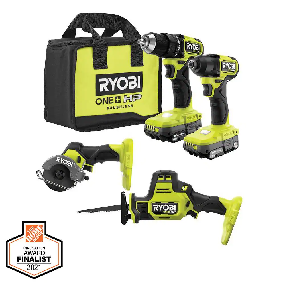 RYOBI ONE+ HP 18V Brushless Cordless Compact 4-Tool Combo Kit with (2) 1.5 Ah Batteries, Charger, and Bag