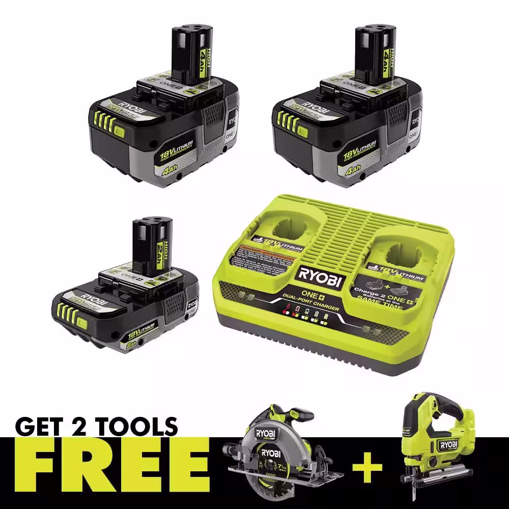 RYOBI ONE+ 18V HIGH PERFORMANCE Kit w/ (2) 4.0 Ah Batteries, 2.0 Ah Battery, 2-Port Charger & (2) FREE ONE+ HP Brushless Tools