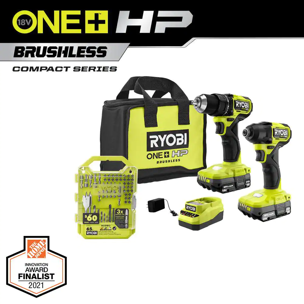 RYOBI ONE+ HP 18V Brushless Cordless Compact 2-Tool Combo Kit w/Drill, Impact Driver, Batteries, Charger, Bag, & 65PC Bit Set