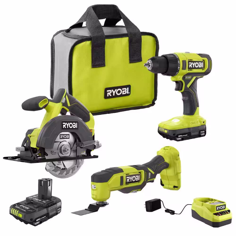 RYOBI ONE+ 18V Lithium-Ion Cordless Combo Kit (3-Tool) with (1) 1.5 Ah Battery and Charger