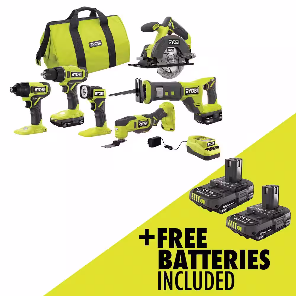 RYOBI ONE+ 18V Cordless 6-Tool Combo Kit with 1.5 Ah Battery, 4.0 Ah Battery, Charger, and FREE 2.0 Ah Battery (2-Pack)
