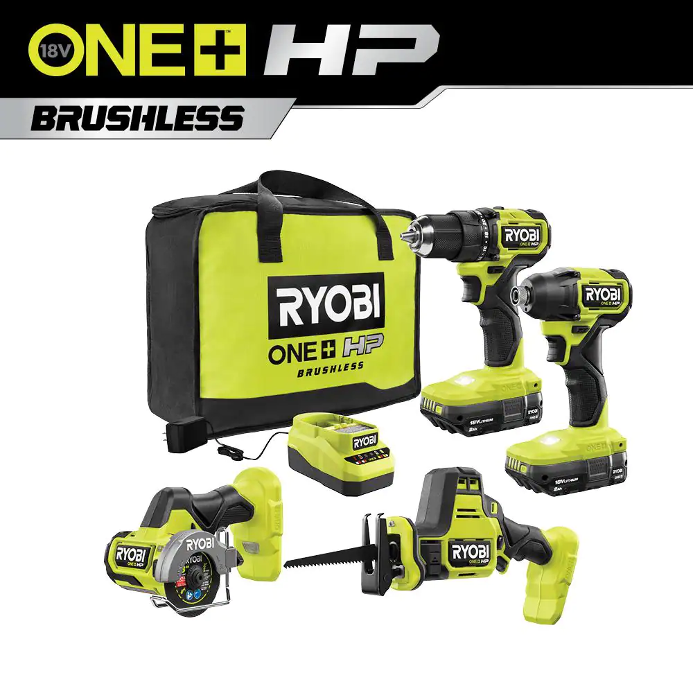 RYOBI ONE+ HP 18V Brushless Cordless Compact 4-Tool Combo Kit with (2) 2.0 Ah Batteries, Charger, and Bag
